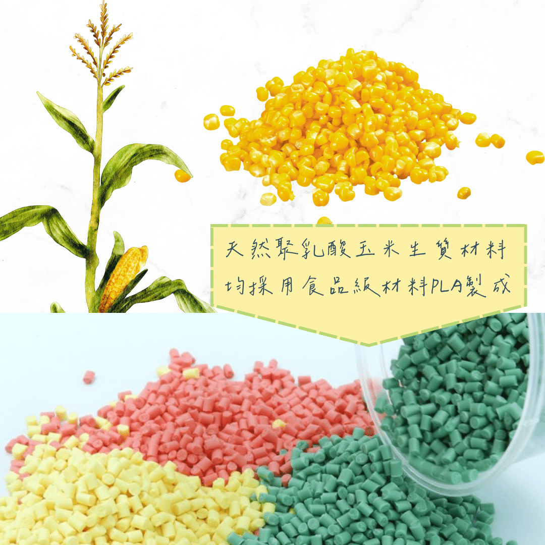 – 天然聚乳酸 PLA玉米生質材料製成,不污染環境。